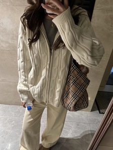 跨境工厂复古连帽针织上衣秋冬麻花毛衣双拉链外套软糯开衫毛衣女