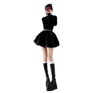 秋冬季半高领打底内搭显瘦小黑裙感气质千金公主蓬蓬连衣裙女装