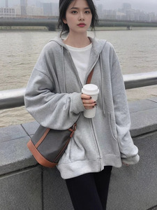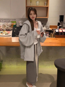 春秋灰色宽松开衫外套中长款卫衣女设计感秋季上衣纯色拉链