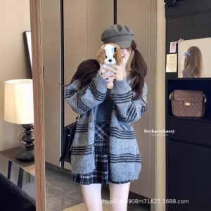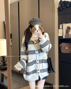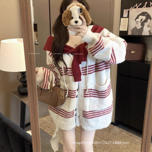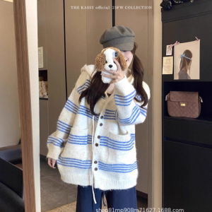 跨境慵懒风撞色条纹长袖毛衣外套女秋季减龄宽松连帽针织开衫上衣