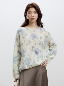 【蝴蝶印记】印染马海毛一字领针织衫女罩衫2025秋季新款宽松毛衣