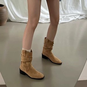 韩版简约风堆堆褶皱粗高跟瘦瘦靴女秋冬复古款时尚百搭中筒瘦瘦靴