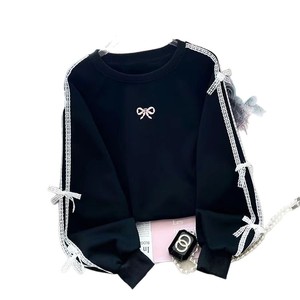 春秋季新款设计感蕾丝拼接蝴蝶结刺绣黑色卫衣女装韩版圆领显瘦潮