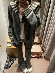 海军领灰色毛衣女秋季穿搭慵懒学院风撞色条纹设计感针织开衫外套