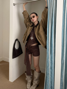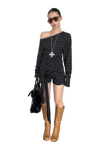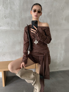 MMFISH时髦街头休闲咖色条纹斜肩褶皱上衣围裹式短裤套装25L482