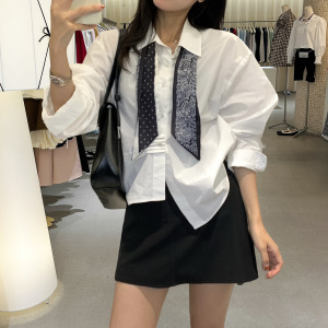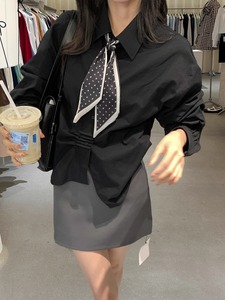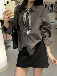 十三行2025秋装港风通勤翻领宽松压褶咖啡色气质衬衫长袖上衣女