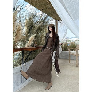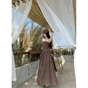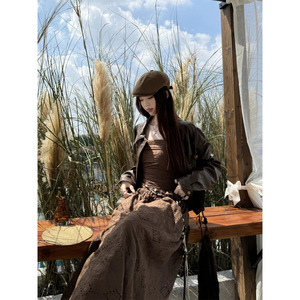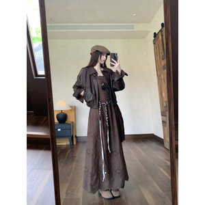2025早秋新款度假风法式重工镂空显瘦抹胸连衣裙+百搭PU皮衣外套