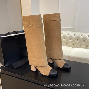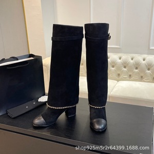 高端2025秋冬小香真皮拼色复古粗高跟金属链条高筒骑士靴裤管长靴