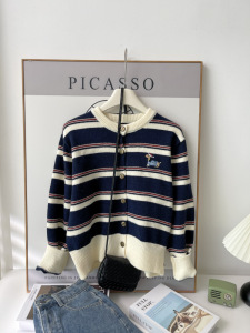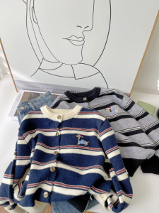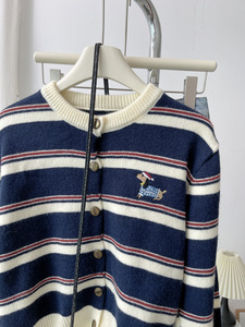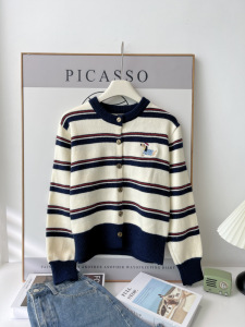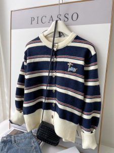 抖音爆款撞色条纹小狗圆领针织毛衣开衫女秋冬小个子百搭上衣6169