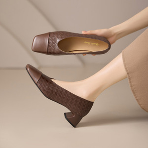 时尚百搭女鞋2025新款编织压花羊皮方头粗跟通勤套脚真皮浅口单鞋
