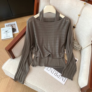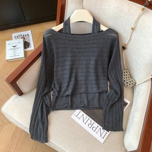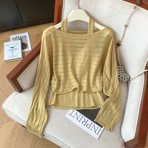 实拍显瘦针织长袖叠穿挂脖背心女秋季新款韩系条纹洋气百搭两件套