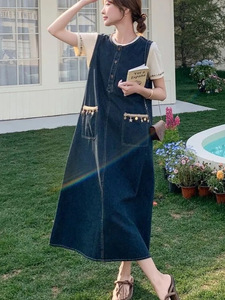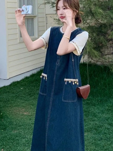 韩系牛仔背心连衣裙女夏季新款无袖背心单排扣中长裙复古大口袋裙