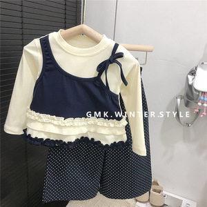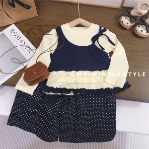 女童时尚套装韩系秋季新款儿童洋气花边假两件上衣波点阔腿裤外贸