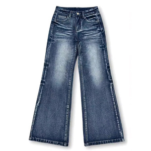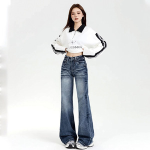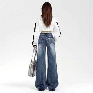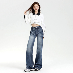 2025新款裂痕美式高腰阔腿牛仔裤女春秋高街直筒宽松不贴腿微喇裤