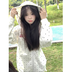 美式风拉链连帽卫衣女春秋大码胖mm穿搭休闲宽松长袖外套波点上衣