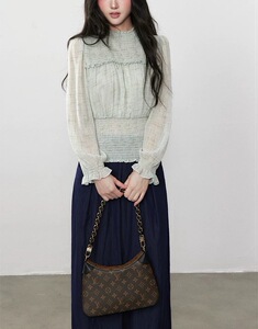 通勤简约百搭秋季绿色圆领雪纺收腰显瘦防晒长袖上衣女