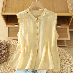 女士亚麻无袖上衣2025新款夏季透气背心立领苎麻小衫棉麻薄款衬衫