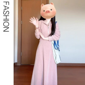 2025秋季新款粉色卫衣裙小个子中长裙设计感连帽抽绳休闲连衣裙女