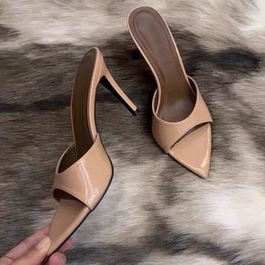 拖鞋女夏外高跟鞋尖头一字漆皮高级感一字裸色2025新款超火