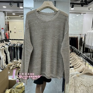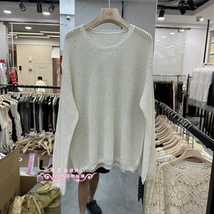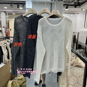 欧洲站2025早秋新款时尚圆领镂空钩花订亮片百搭微透针织衫上衣女