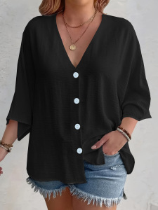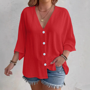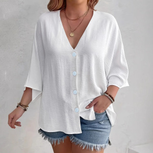 2025春秋新款欧美亚马逊独立站女装v领纽扣冰丝皱纯色开衫七分袖