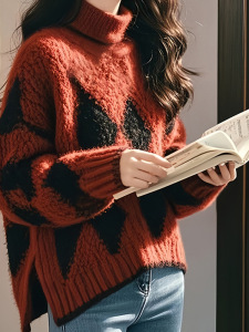 红色菱格高领内搭针织毛衣女2025新款春季新款设计感chic韩系上衣