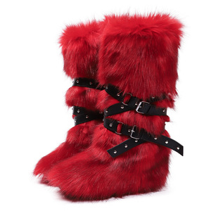 2025跨境新款辣妹高筒绑带毛毛靴子女亚文化加绒铆钉狐狸毛雪地靴