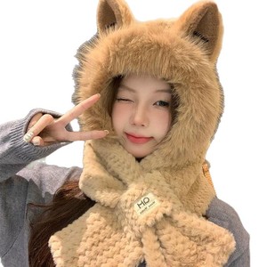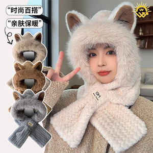 秋冬潮款可爱小熊毛绒护耳帽加厚保暖围巾一体帽子女保暖围脖连帽