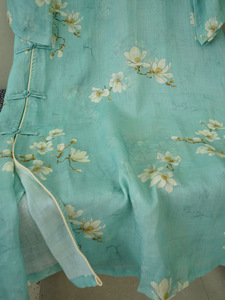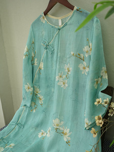 夏季新款 新中式苎麻印花单层圆领斜襟手工盘扣气质旗袍裙238267