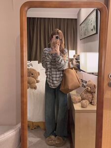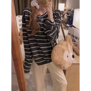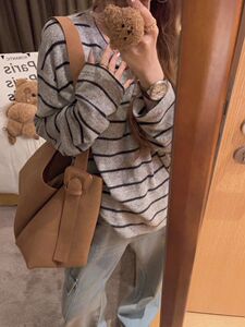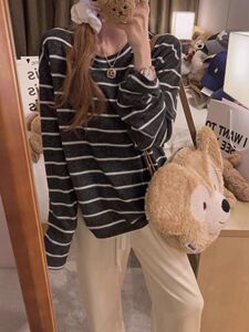 秋天浅灰色条纹长袖内搭T恤女慵懒风宽松加厚打底衫新款百搭上衣
