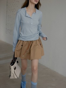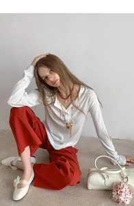 字母贴布绣开口亨利领设计感长袖宽松亮片T恤女