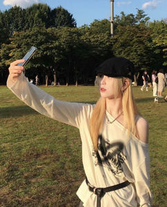 现货25年秋冬韩国小众潮牌复古爱心印花船领斜肩露肩T恤女上衣