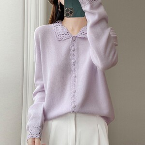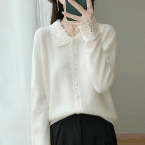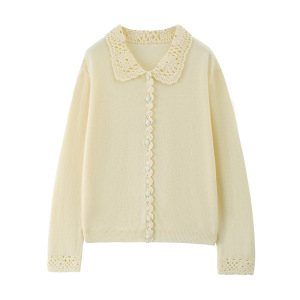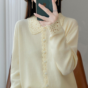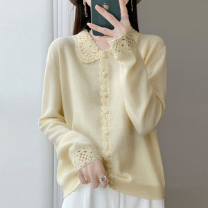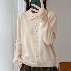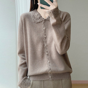 重工钩花秋冬新款Polo翻领减龄羊毛开衫女时尚气质百搭羊绒打底