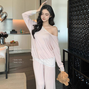 法式莫代尔睡衣女春秋套头长袖长裤露肩温柔蕾丝纯欲风家居服套装