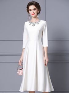 智丽重要场合漂亮连衣裙2025早秋新款白色钉钻七分袖收腰A字裙子