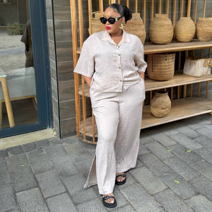 欧美女装翻领慵懒风纯色开衫衬衣开叉阔腿长裤女非洲时尚优雅套装