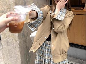 复古卡其色拼接格纹夹克外套女秋季小个子宽松廓形上衣