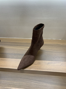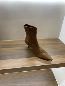 高跟尖头绒面卡其色瘦瘦靴短靴女鞋2025新款春秋单靴韩系小裸靴子