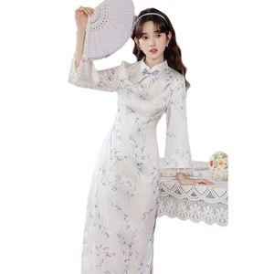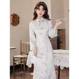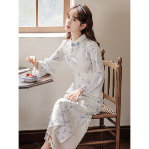 新中式改良旗袍连衣裙女蕾丝拼接假两件设计感国风蓝色碎花流苏裙