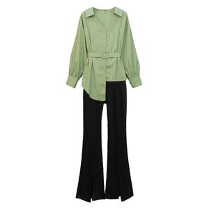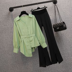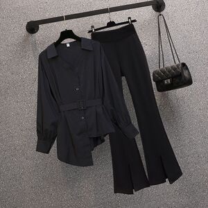 胖妹妹微喇裤两件套大码女装衬衫时尚套装显瘦套装早秋单件收腰