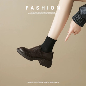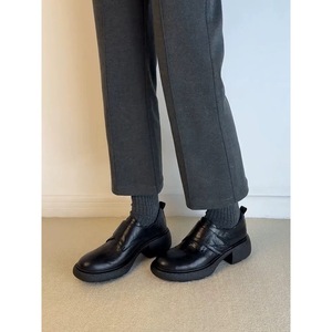 牛皮舒适通勤粗跟乐福鞋女厚底秋季新款圆头魔术贴深口复古单鞋女