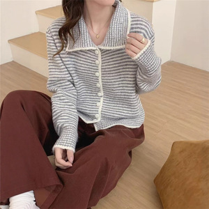 韩系简约条纹翻领毛衣开衫女秋冬新款宽松复古单排扣针织上衣外套