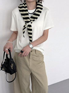 黎诺早秋新款韩系羊毛条纹披肩短袖T恤女2025时尚洋气两件套上衣