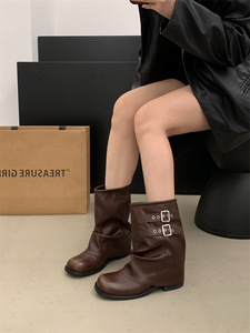 褶皱堆堆靴女2025年新款黑色美拉德中筒靴女西部靴机车马丁靴