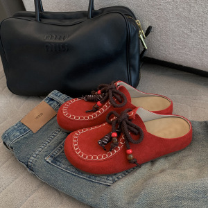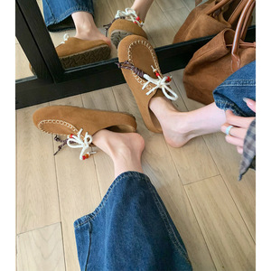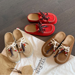 葡萄妈时髦真皮厚底大头勃肯鞋系带外穿增高包头半拖鞋女2025春秋