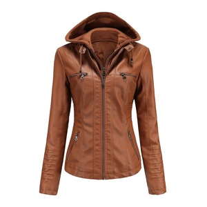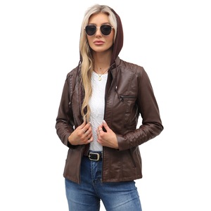 23欧美跨境连帽皮夹克两件套可脱卸大码皮衣女春秋外套女PU水洗皮