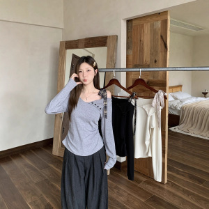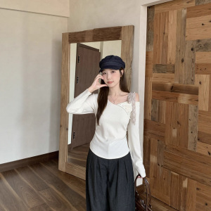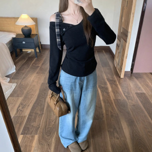2025秋装新款胖mm大码女韩系温柔风撞色绑带露肩长袖T恤