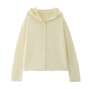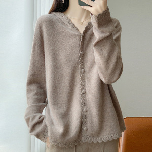 女式100丝光羊毛帽衫V字领针织开衫甜美风花边设计感外套长袖毛衣
