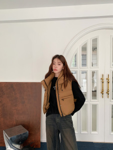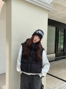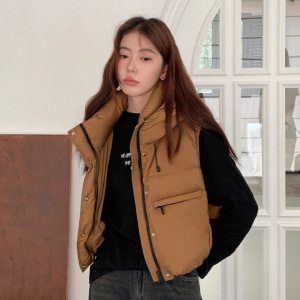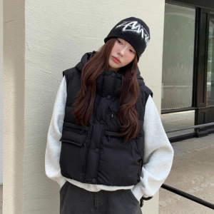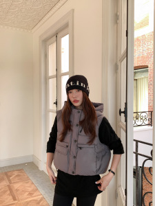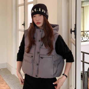 2025欧货连帽短款羽绒马甲女时尚韩版洋气工装显瘦坎肩马夹外套潮