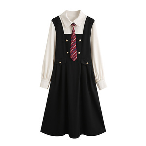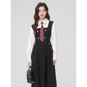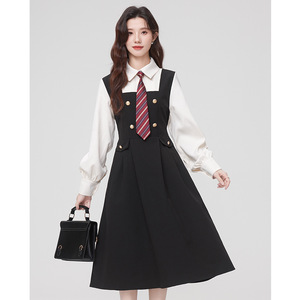 学院风新款教师教资面试穿搭假两件拼接收腰连衣裙女正式场合长裙